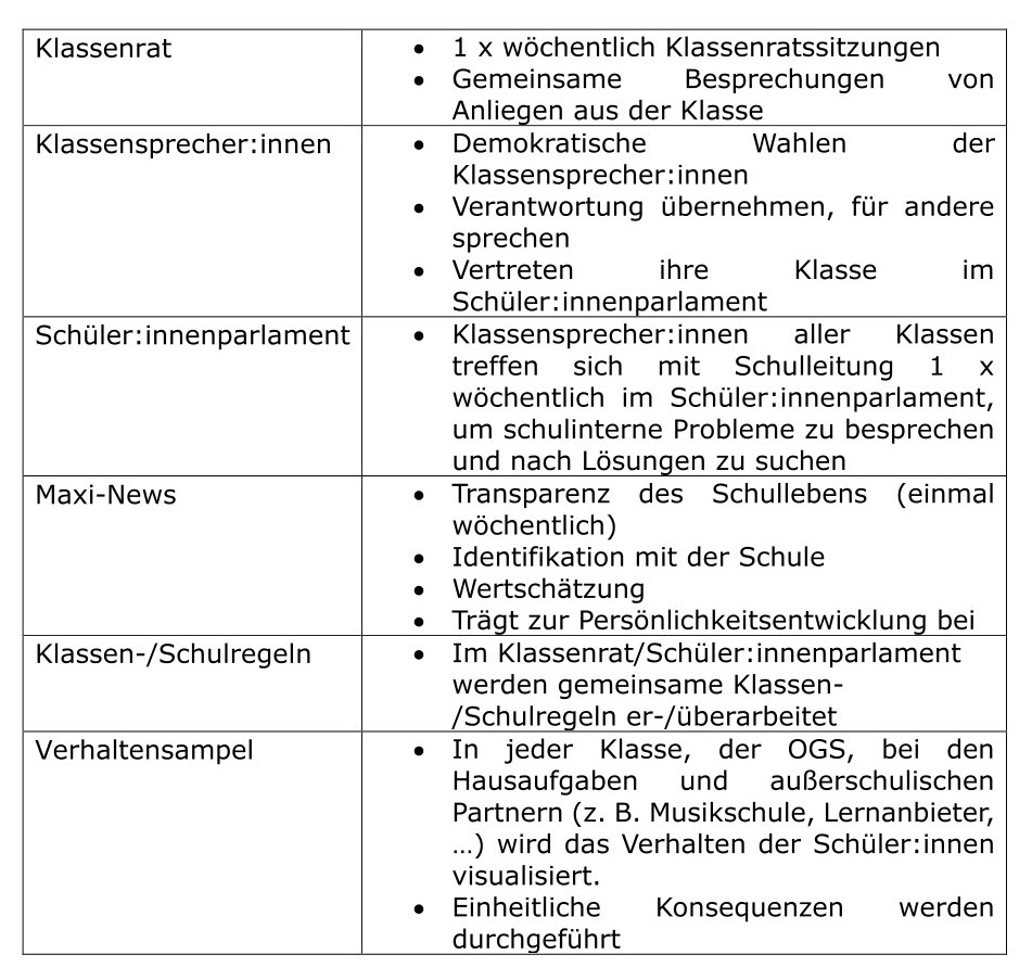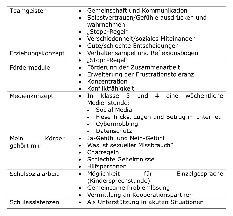 - Prävention von grenzverletzendem Verhalten gegenüber Lehrkräften, Mitschüler:innen und allen in der Schule tätigen Mitarbeitenden, z. B. Hausmeister, OGS-Mitarbeitende, Sekretärinnen und Sekretäre…